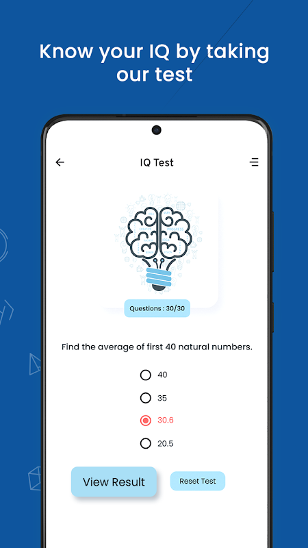 =>智商測試包括邏輯推理問題,並根據答案檢查您的智商水平。 (它還會在所有問題的結果時給出正確的答案)