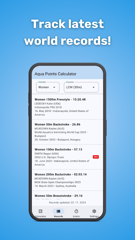推出一款非官方應用程序,旨在幫助游泳運動員及其教練進行 Aqua Points 計算。這個應用程式允許您根據時間計算分數,反之亦然。隨著世界游泳聯合會從 FINA 更名為 World Aquatics,該應用程式也使用了積分系統的新名稱——從 FINA 積分改為 Aqua Points。此外,該應用程式還提供所有世界紀錄的列表,確保其與最新的積分錶保持同步,並在新紀錄設定時進行更新。它還包括重大國際比賽的資格標準。