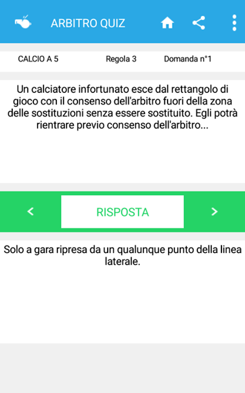 Le domande sono divise per Regolamento e per Regola e mostrano la risposta corretta soltanto alla pressione del tasto "RISPOSTA". Questa funzionalità permettere all'utente di pensare la risposta senza leggerla, in modo da esercitarsi per superare i quiz tecnici a cui sono sottoposti periodicamente gli Arbitri e testare la propria conoscenza regolamentare.