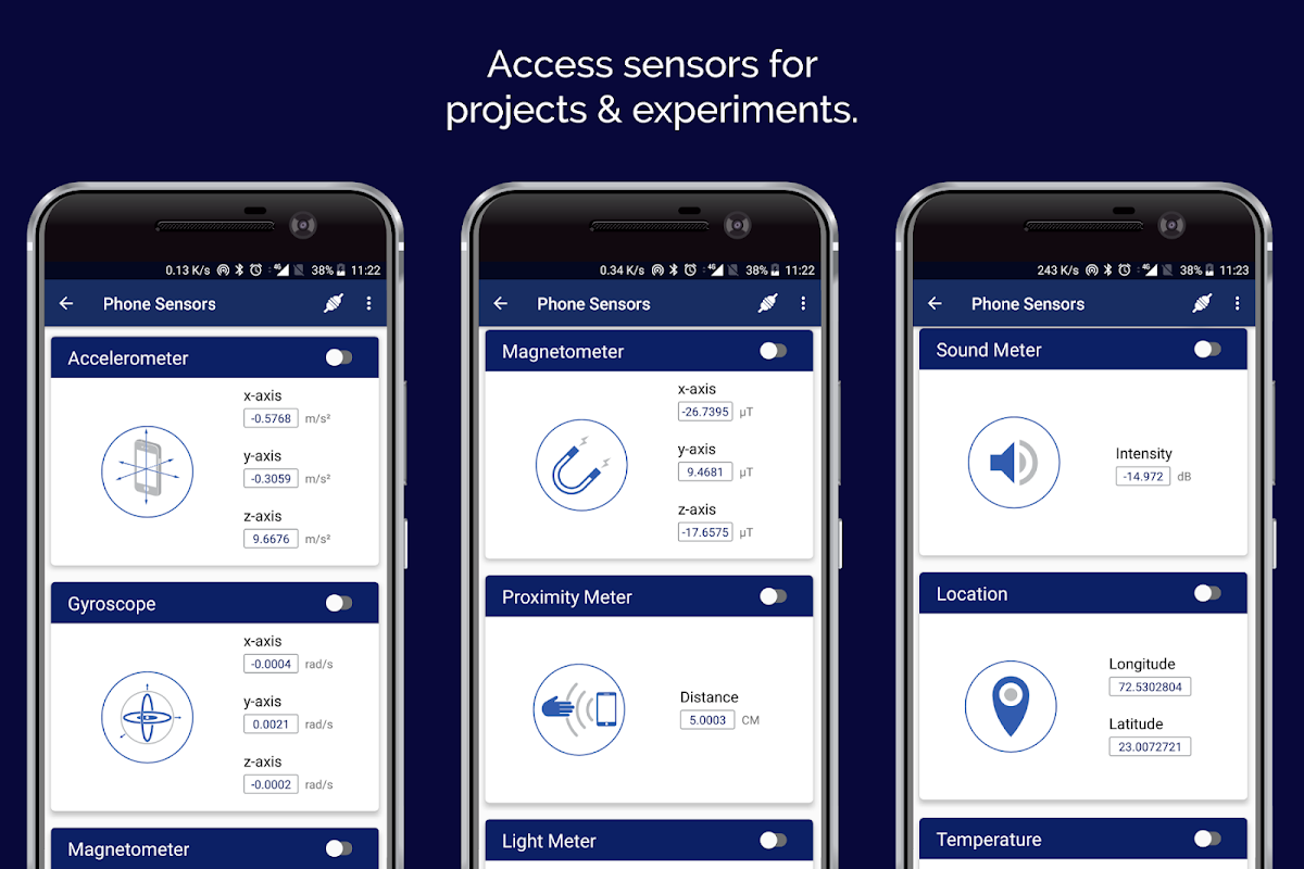 • 手機傳感器:訪問智能手機的不同傳感器,例如加速度計、陀螺儀、接近傳感器、磁力計、光傳感器、聲音傳感器、GPS、溫度傳感器和氣壓計,以制定項目並進行實驗。