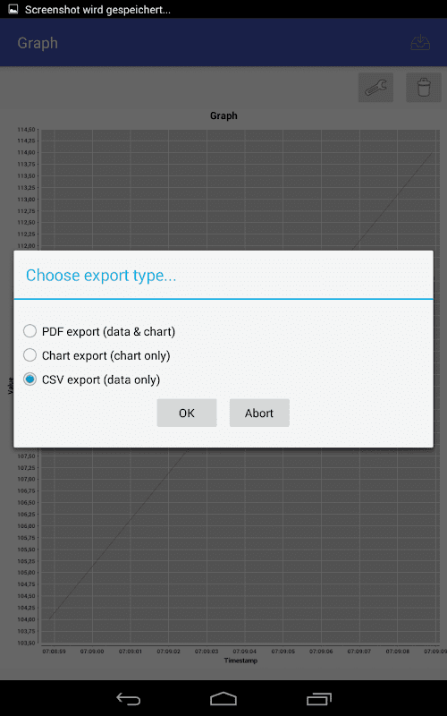 Diese App dient zum anzeigen von Daten welche über die Serielle Schnittstelle geliefert werden. Die empfangenden Daten können dabei als Diagramm angezeigt werden. Das Diagramm aktualisiert sich selbstständig bei jedem neuen Wert. Des Weiteren können die Daten als PDF, CSV und als PNG exportiert werden.