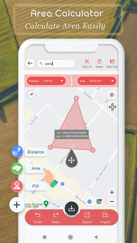 面积计算器和测量是一个独特的工具,可用于通过地图进行视场角查找。 土地体积计算器应用程序可以非常轻松地准确计算大面积土地和农场距离,而不会影响时间。 面积测量是完全免费且用户友好的应用程序。 面积计算器:土地测量应用程序的工作方式是,您可以将图钉放置在坐标中,放置后您可以轻松获得沿经度和纬度的面积测量值。 地图上任何点的测量和结果都会以不同的单位生成。 您可以根据需要互换长度单位。