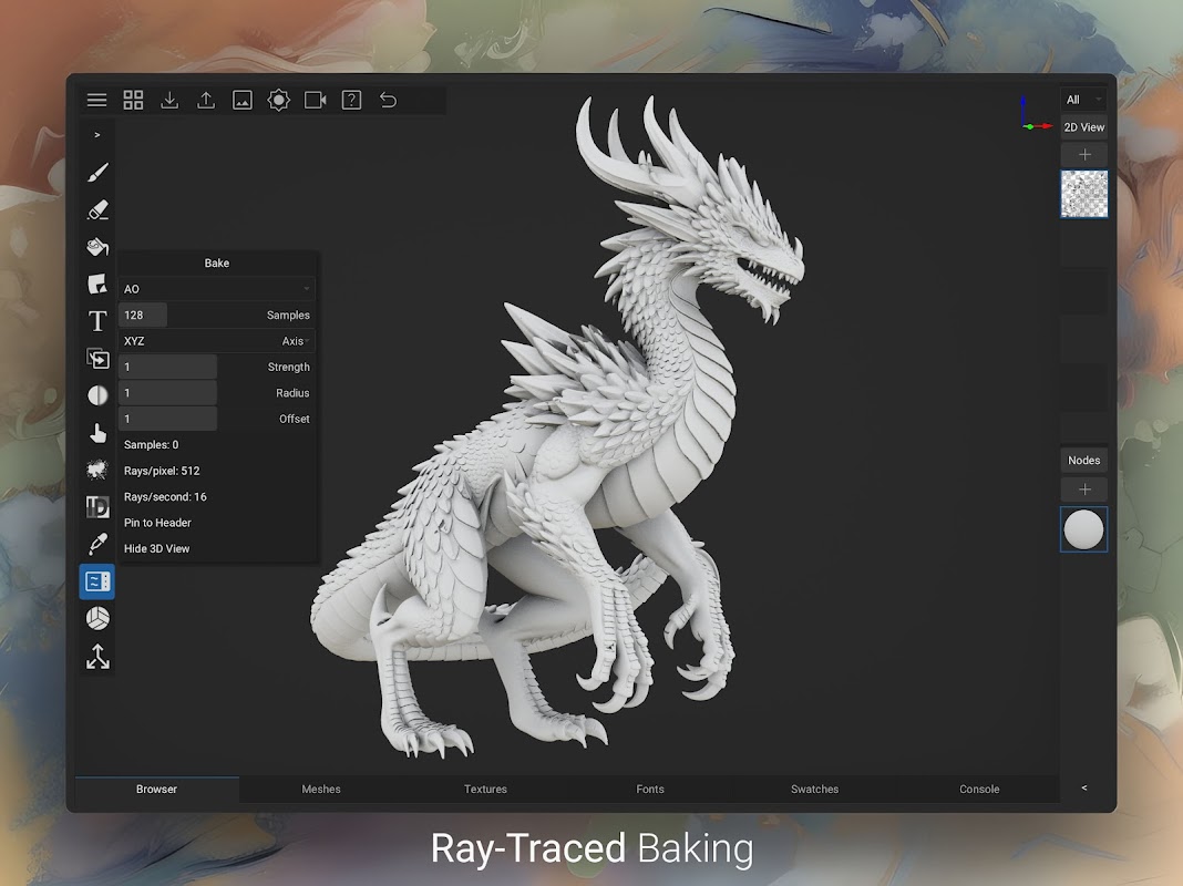 在您的 Android 裝置上即時烘焙高多邊形模型的紋理貼圖。支援的設備上提供硬體加速的光線追蹤烘焙功能。 (需要 Vulkan 光線追蹤)