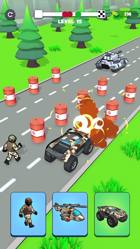 每場比賽都充滿了動態的關卡,並設有各種挑戰,旨在測試您的反應和決策能力。遇到不同的障礙,如牆壁、路障和坑,將你的軍隊變成坦克、直升機或其他特種部隊來克服它們。時機和策略就是一切——選擇正確的轉變以在整個比賽中保持速度和效率!
