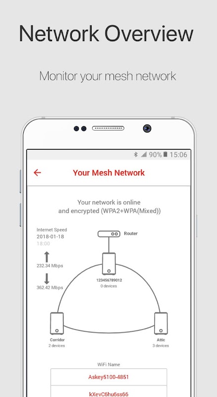 在亞旭無線網狀網解決方案的完美伴侶。該阿斯基於WiFi Mesh應用,您的家用Wi-Fi網絡的完全控制。多虧了這個應用程序,你了解和管理有關WiFi網絡幾乎一切。命名您的WiFi設備並將其放置在不同的房間。輕鬆選擇您的Wi-Fi網絡的名稱和密碼。請檢查您的連接速度。創建特定的證書,並給予您的訪客訪問。定義家長控制和調度開啟/關閉WiFi連接倍。讓您的家庭網絡隱私安全 - 您只需打開應用程序,看看誰是連接到您的網絡,並授予或拒絕在輕點幾下訪問。安裝,配置和監控你的WiFi網絡從來就不是那麼容易了。