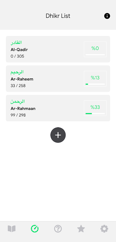 使用 Asmaul Husna 應用程序中的智能 tasbih 很容易 dhikr 為真主的 99 個名字。 Tasbih 計數器提供可訪問選項,例如聲音和振動警報,以及有用的功能,例如初始值和計數器目標設置。您可以將計數器目標選擇為 Asmaul Husna Dhikr Numbers(根據 abjad 值),也可以執行免費的 Asmaul Husna tasbih。