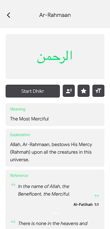 Asmaul Husna,意為最美的名字;它用於真主的 99 個名字,天地的主人,宇宙的創造者。Asmaul Husna 的重要性在古蘭經和各個領域的聖訓。每個信仰伊斯蘭教的信徒都必須學習真主的名字並不斷地重複它們。我們的先知(S.A.W.)希望這些名字被人們知道,被引用,並且在任何時候都能通過沉思來感受。誰通過理解記住了安拉的名字,誰就獲得了天堂。使用 Asmaul Husna 應用程序,您可以閱讀真主的名字及其讀物、簡短的含義、長的解釋。您也可以使用 阿拉伯語 Asmaul Husna 測驗 dhikr 真主的名字並測試自己。 Asmaul Husna 的重要性在經文和聖訓中有所體現: