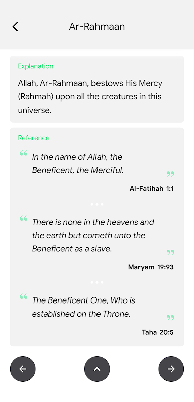 使用 Asmaul Husna 應用程序,可以通過阿拉伯語閱讀、簡短的含義、冗長的解釋來學習 99 個真主的名字。您可以將您想稍後在應用程序中閱讀的阿拉的名字添加到您的收藏夾中。文本通過高對比度和可調整大小的字體得到增強,以提供舒適的閱讀體驗。