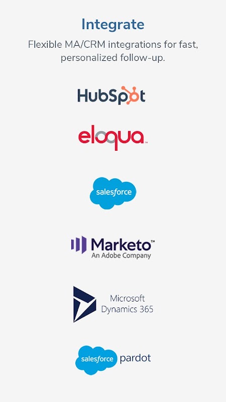 - Follow Up: Send captured lead data to your Marketing Automation and CRM systems for fast, personalized follow up.