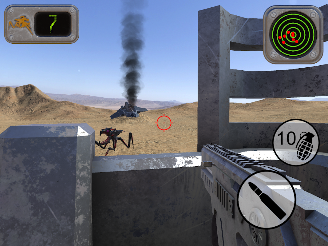 外星蟲子出沒的星球,你對你在沙漠自己。保衛自己對他們無休止的群,只要你能。你必須有效地使用你的槍和手榴彈,讓你周圍的檢查。在屏幕頂部的雷達將幫助您知道哪裡有蟲子。您可以通過點擊它的標誌移動到一個新的位置。建議使用陀螺儀,但如果你想用它操縱桿選項。玩遊戲把你的設備在你的面前,而站起來,轉了一圈看看。你有多少錯誤可以殺死?