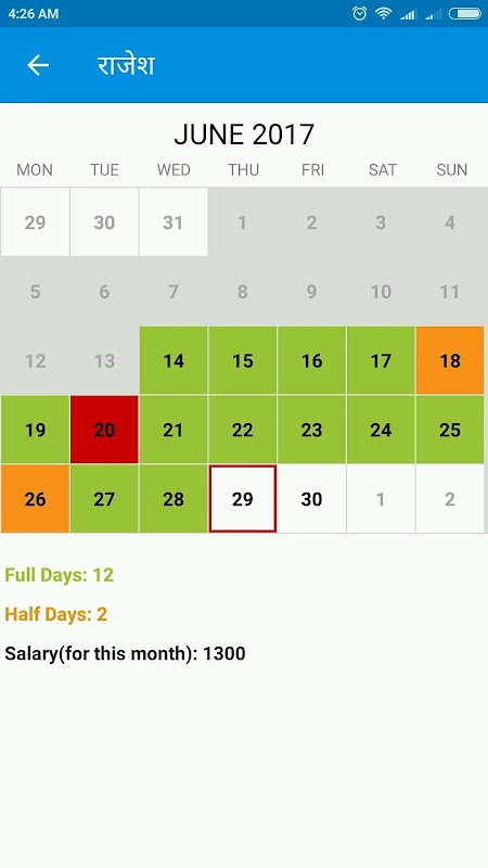 - 選項標記整整一天,半天,缺席和節假日給員工出勤日曆。
