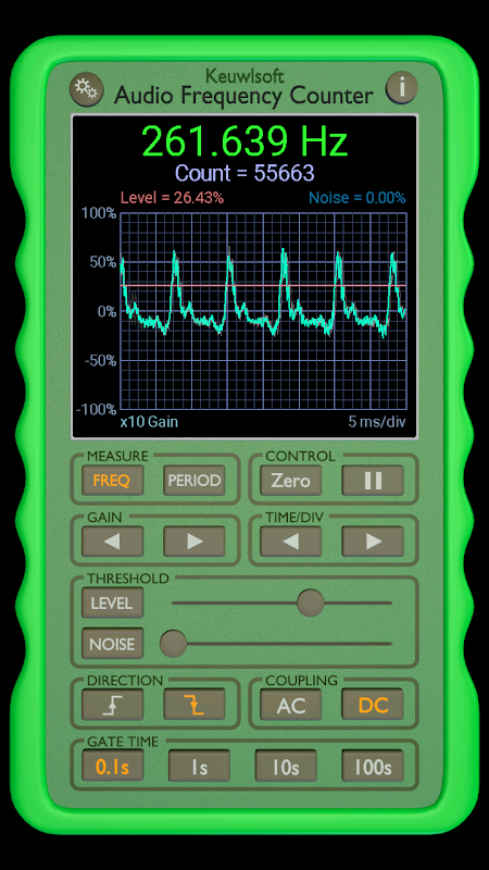 基於麥克風輸入的頻率計數器。 當輸入上升或下降超過設定水準時進行計數,並轉換為頻率或時間週期。 僅供參考。 結果取決於您的設備及其硬體。 如果您只想知道諧波聲音的頻率(例如樂器),基於 FFT 的應用程式(例如 keuwlsofts 頻譜分析儀或吉他調音器)會更好。 該應用程式可以為單頻輸入訊號提供更準確的頻率測量。特點包括:
