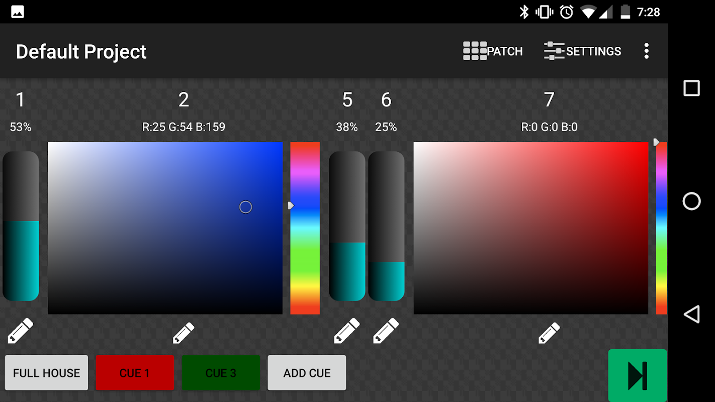 主屏幕的設計使燈板操作員能夠獲得與生產全尺寸電路板相同的感覺。它包含具有通道編號,級別百分比,級別滑塊和編輯按鈕的通道。底部是提示列表。添加Cue將創建當前通道級別的燈光提示,並將其附加到提示列表的末尾。如果長按使用現有的提示,他們就可以編輯它。編輯功能會插入新的提示,刪除提示,重命名提示,以及更改淡入淡出時間。在設置菜單中,從已發現的節點列表中選擇ArtNet服務器,也允許手動輸入。可以將默認提示漸變時間與通道推子的顏色一起指定。補丁視圖中允許通道調光修補。可以根據需要為一個通道分配一個通道。