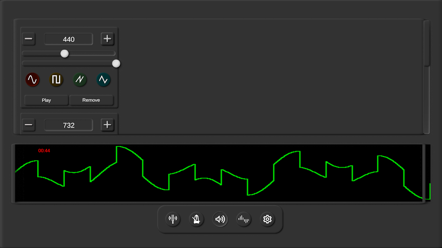 產生乾淨、純淨的聲波,具有完全可自訂的頻率、音量和波形(正弦波、方波、三角波、鋸齒波)。您甚至可以同時演奏多個音調來試驗波幹擾、拍頻和諧波分層。