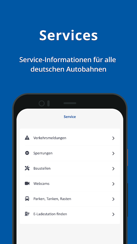 Autobahn 應用程式面向德國高速公路用戶,除了他們使用的導航應用程式中提供的選項之外,他們還尋求有關聯邦高速公路的其他可靠資訊。特別是經常使用的用戶,例如通勤者或專業司機,可以獲得有關當前交通狀況以及計劃和當前建築工地的寶貴附加資訊。道路封閉也整合到該應用程式中。該應用程式還可以直接連結到個人導航應用程式。