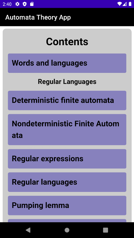 該應用程序顯示自動機理論講授的主題的簡要摘要