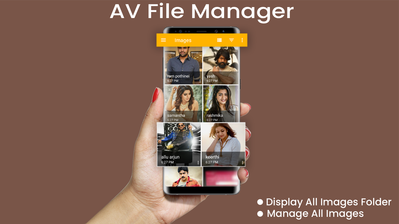 ? Full Featured File Manager ("AV File Manager") It is a Super File Manager("AV File Manager") which provides all features of file management including cut, copy, delete, rename, compress, extract. You can check the file details, full integrated search within the file system. New file and New folders can be created in a second.