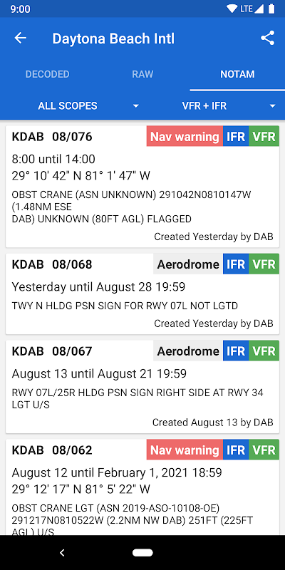 作為獎勵,該應用程序為氣象站提供對NOTAM的訪問,這些氣象站將被下載,部分解碼並且可以單獨標記為已讀。通過這種方式,您可以輕鬆跟踪新的和相關的NOTAM。