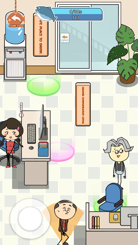 - 與同事搭訕的同時,留意經理的一舉一動。經理將在辦公室巡邏,一旦主角進入經理的視野,就會被抓住,導致遊戲失敗。