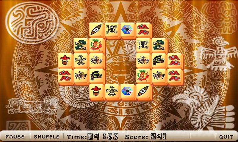Addictive variation of ancient game mahjong. The archaeologists have discovered mahjong tiles near Tenochtitlan and now you have a possibility to play the Aztec variation of the ancient Chinese patience game Mahjong. Click at the identical unlocked items to delete them. The item is unlocked when its two adjacent sides are opened. You win when all items are deleted.