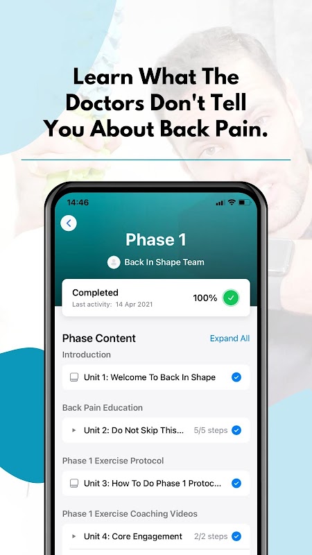 Back In Shape 計劃分為四個階段,從第 1 階段開始,您可以立即免費訪問。您會找到支撐整個計劃的教育視頻。以及特定的鍛煉和拉伸程序,將為未來的進步奠定重要的基礎。