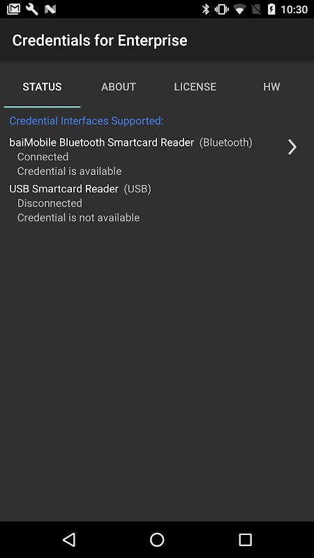 baiMobile® Credentials for Enterprise (Credentials 4E) 應用程序是一項後台服務,可為來自不同讀卡器供應商的各種智能卡讀卡器提供支持。 Credentials 4E 被那些嵌入了 baiMobile® Framework for Credential Services(一組 SDK 庫)的應用程序所利用。有關嵌入 baiMobile® 憑證服務框架的 Android 應用程序列表,請訪問我們的網站 http://www.baiMobile 或發送電子郵件至 [email protected] 或 [email protected]。必須安裝並運行 Credentials 4E,以便此類應用程序訪問存儲在智能卡上的密鑰和數字證書。