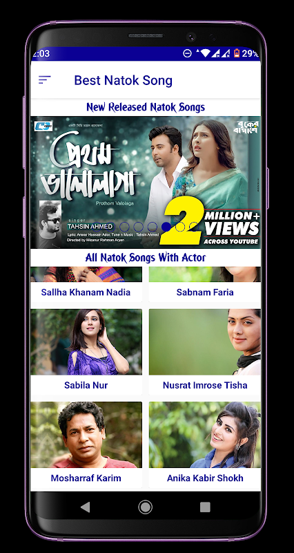 If you are like bangla natok natok song this app perfect for you.Here is all bangla natok song,video is available here.Here is your all favorite natok song with category like arfan nisho natok,apurba natok,mehazabian natok,tisha natok,tanjim tisha natok,tahasan natok,safa kobir natok,jovan natok,momo natok,nadia natok & more actress natok song is available