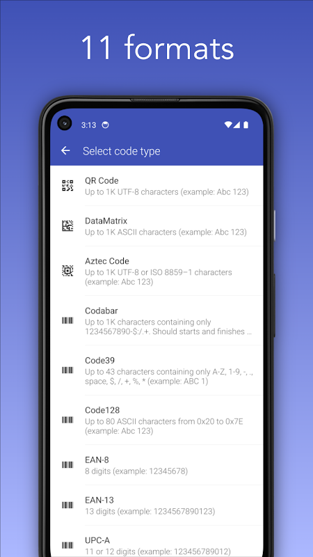 QR Code、Data Matrix、Aztec、Code 39、Code 128、EAN-8、EAN-13、UPC-A、ITF、Codabar、PDF417