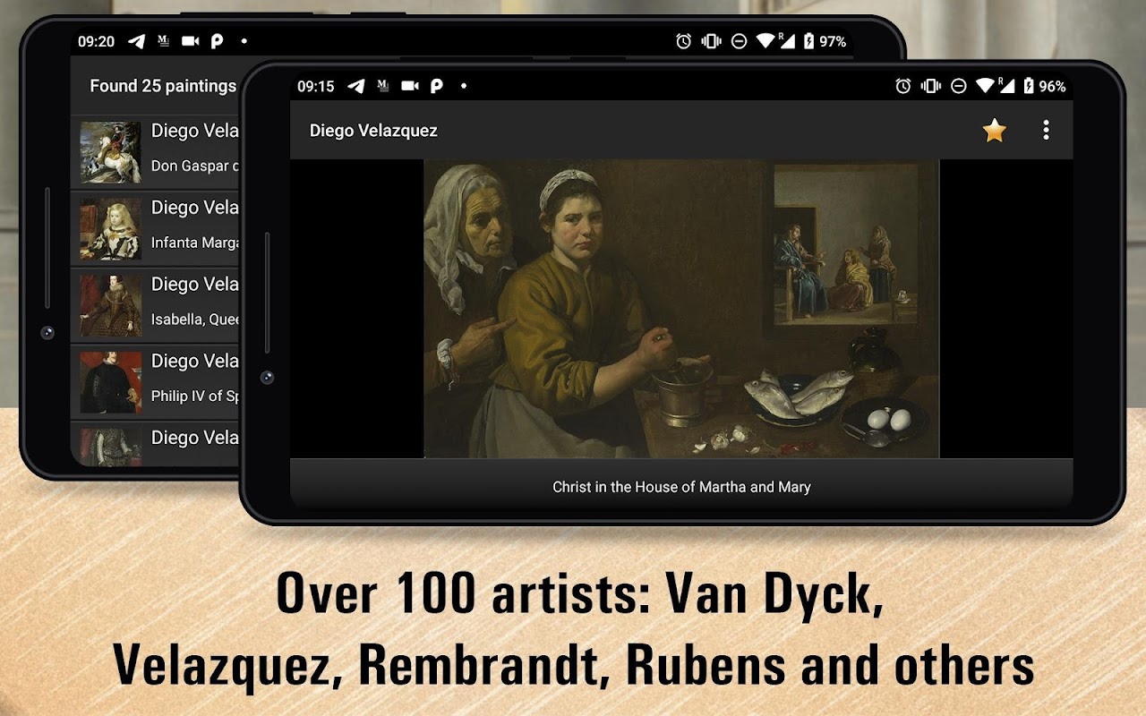 該應用程序包含了大量的1149幅繪畫作品,包括100位不同的藝術家 - 包括Michelangelo Merisi da Caravaggio,Peter Paul Rubens,Anthony van Dyck,Rembrandt van Rijn等等。