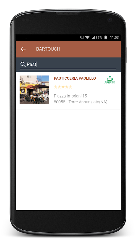 現在就來試試BarTouch,移動應用程序,這將幫助你找到你所在地區所有的酒吧和蛋糕店,所有的相關信息,如地址,開啟和關閉時間,電話號碼,客戶評價,尤其是可能性諮詢直接從您的智能手機預訂你的咖啡。啊,這是完全免費的。
