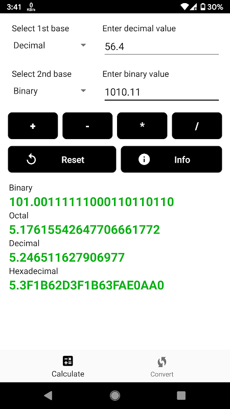 這是唯一提供計算和轉換二進制、八進制、十進制、十六進制數字和小數點功能的應用程序,您只需輸入兩個輸入,基本計算器將為您提供結果。