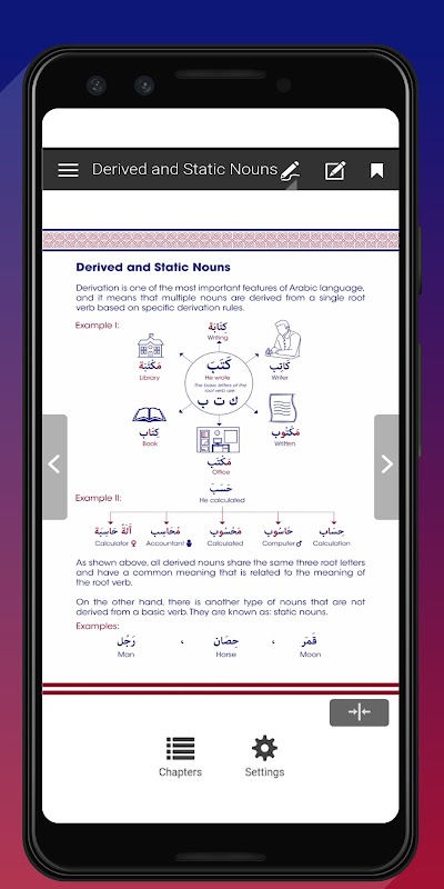 這個應用程序是一本交互式電子書,包括基本的語法規則,例如名詞、代詞、形容詞、動詞、副詞、介詞等,以及我們如何使用它們來構建句子。除了關注句子中單詞的語法情況之外,還可以幫助學習者避免語法錯誤,從而使他的阿拉伯語語言準確而有力。