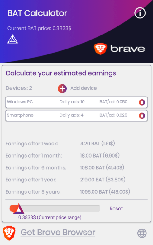 You can calculate your estimated Basic Attention Token (BAT) earnings by adding multiple devices for example your Smartphone and your private computer. The app will give you an overview about the estimated BAT you will earn in the next weeks, months or even years. So lets have a look at this interesting numbers which are often underestimated!
