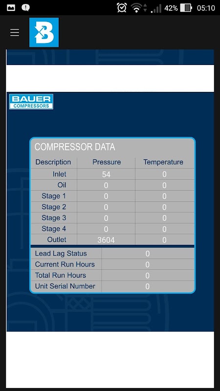 The Bauer Mobile Dashboard™ function within the app provides a simple visual dashboard-type overview of the compressor system which allows the user to monitor all critical functions and values of their Bauer Compressor system in real-time. The Bauer Mobile Dashboard™ also displays real-time system status as well as all current system alerts and faults.