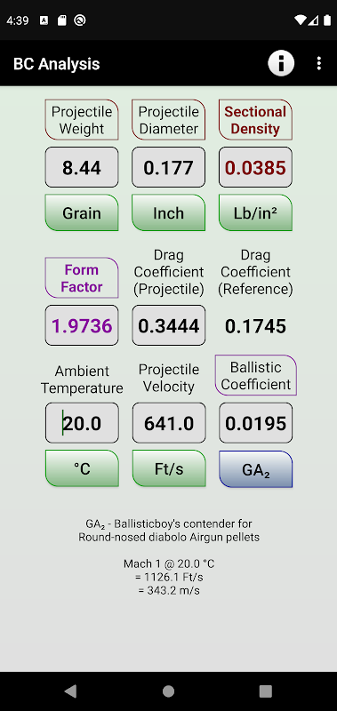 鑑於彈丸重量、直徑、彈道係數和相關阻力定律,該應用程序詳細介紹了截面密度、形狀係數、彈丸阻力係數和參考阻力係數(相對於特定速度、環境溫度和阻力定律)。