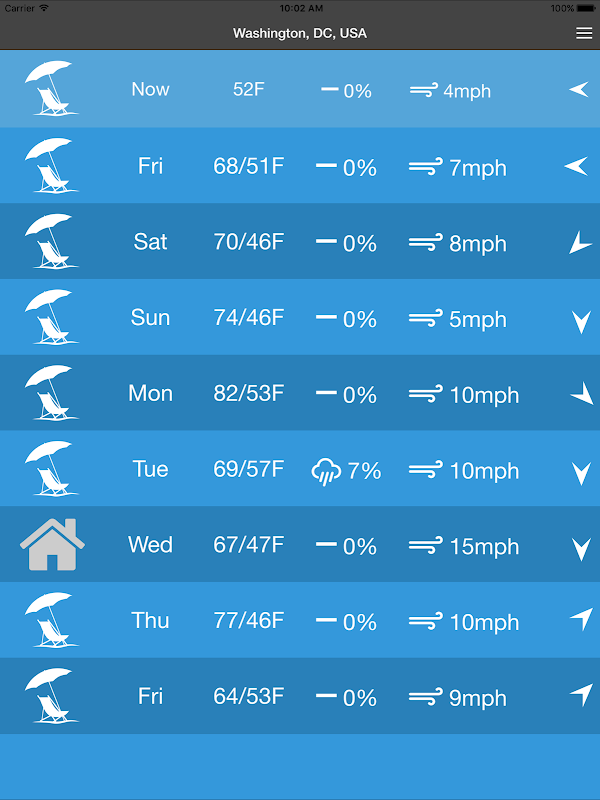 Beach Weather is a simple app used to determine if the weather is good enough to go to the beach based on your preferences. Set your preferred weather conditions for temperature, rain, wind and a beach icon is displayed if the weather is within those parameters, a home icon is displayed otherwise.