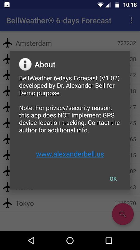 BellWeather 6-days Forecast Android app enables search for the Geolocations and generating 6-days forecast. The app implements intuitive user-friendly interface adapted for any form factor (Android smartphone/tablets) Internet connectivity is required for this application.