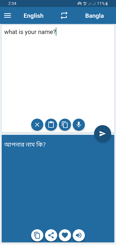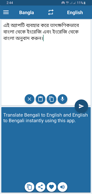 2. **文字輸入和輸出**:使用者可以透過打字、語音輸入或貼上文字進行翻譯來輸入孟加拉語或英語文字。該應用程式即時提供翻譯文字。