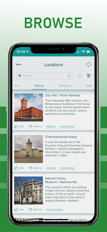 • 排序和過濾以最佳化規劃。柏林很大,一次旅行有太多的景點可以參觀。我們縮短了列表,僅包含最重要和最受歡迎的地點。您可以按照受歡迎程度或與住宿地點的距離進行排序。使用過濾器僅顯示符合您個人喜好的景點。