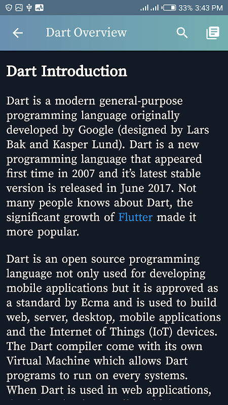 Learn Dart Programming language from Beginner to Advanced concept. The tutorial app teaches you core Dart concept that you can apply into developing websites, Android & iOS Mobile Applications using flutter and Server side System Softwares. The application is majorly collections of best dart learning resources online.