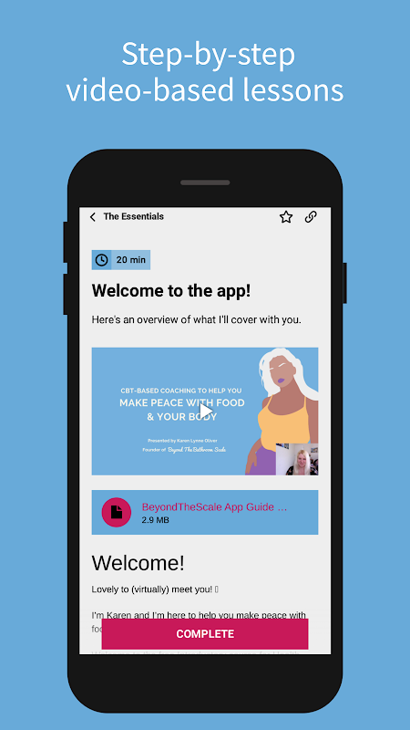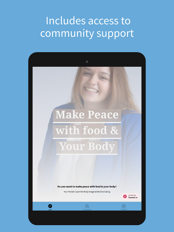 為期 6 天的免費課程將教您在一生節食後開始與食物和身體和平相處所需的所有基礎知識。您將了解直覺飲食、身體積極運動和 HAES 方法。您還可以在應用程序中購買教練計劃的訪問權限。