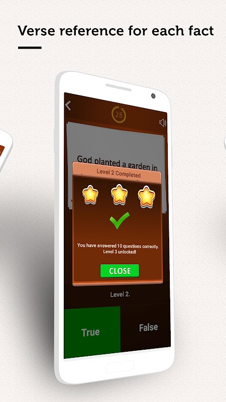 遊戲有 100 個關卡和 1,000 個精心製作的聖經事實,旨在測試您的知識並幫助您加深對上帝之言的理解。問題採取難度遞增的形式——你可以從簡單的問題開始,逐漸進步到中等、困難和專家級別,最後是一些即使是最有經驗的聖經學者也會感到挑戰的特殊問題。每個事實都附有詩句參考,因此您可以找到相應的經文並深入研究。