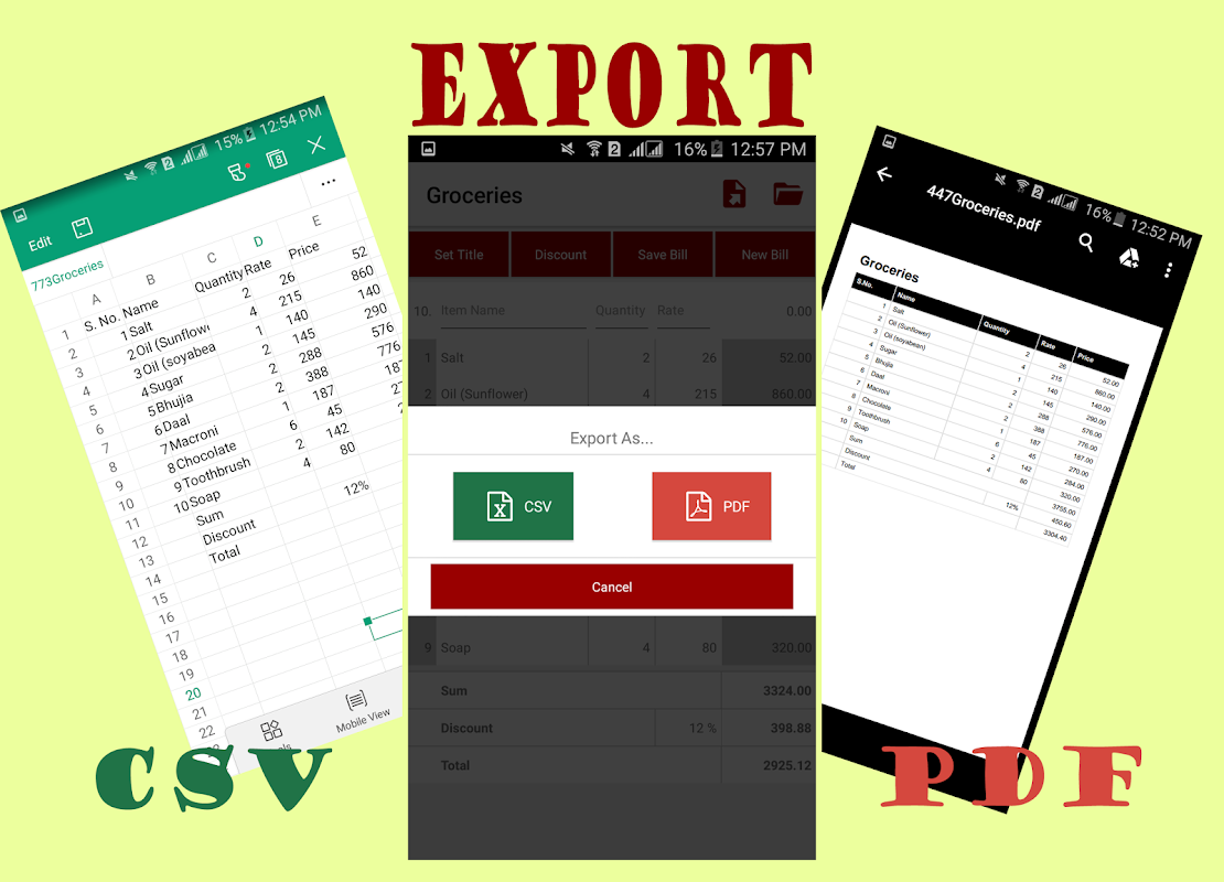 All can be solved! We release this product that saves you from doing dull calculations every time. You have the option to enter items name, quantity and rate. Then, the bill is generated automatically. You can share the files with others by exporting it to PDF or CSV.