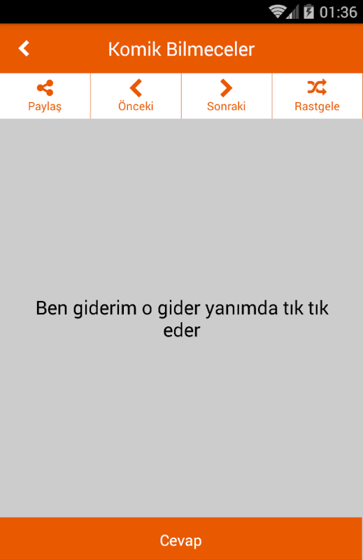 來自9個類別的5.000個離線滑稽謎語及其答案在這裡。您可以閱讀並向朋友詢問謎語,這些謎語既可以娛樂您,又可以使您發笑並可以教您。使用隨機的謎語閱讀按鈕,您可以度過愉快的時光。最新的謎語,最有趣的謎語和最新的謎語已在我們有趣的謎語應用程序中取代了他們的位置。您應該嘗試使用免費的謎語應用程序來獲取有趣的土耳其語謎語。謎語遊戲和答案可用土耳其語提供給您。您可以與您的朋友一起玩我們的益智遊戲應用程序。您還可以一鍵式在社交平台上與您的朋友分享您想要的難題。玩拼圖2021