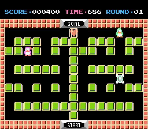 Kiku and Megu are the two penguins that you must help guide to either side of the caged heart at the top of every stage. The penguin that you choose at the start of the game follows your every instruction, while the other reverses lefts and rights. Since the maze is not symmetrical, it will take a little coordination to help both penguins reach the heart at the exact same time. The penguins can not touch spider and fire, or you will lose one chance. If one walks into a spider web, it will become trapped until the other can be directed over to the rescue. If both get trapped, it's lights out.