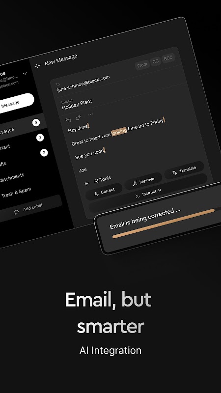 使用我们的集成人工智能工具增强您的电子邮件体验。让人工智能创建、纠正、优化和翻译您的消息。释放全新的生产力水平并在几秒钟内撰写精美的电子邮件!当然,完全可选。