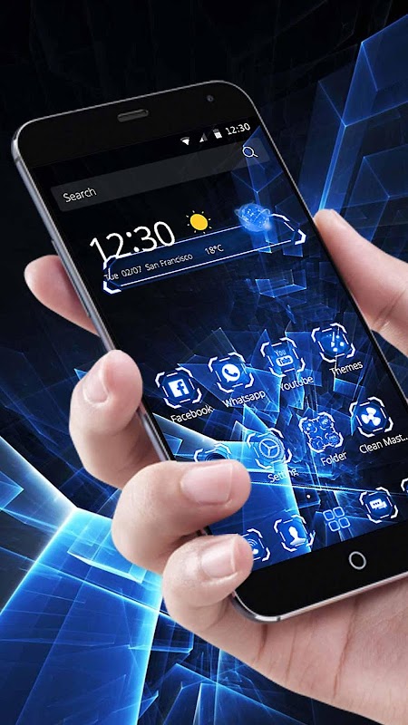 酷炫抽象科技高清手機主題有色暗黑色調藍色科技壁紙以及藍光科技圖標包,閃亮的藍色光環酷炫非常,馬上用這款主題裝飾你的手機吧!