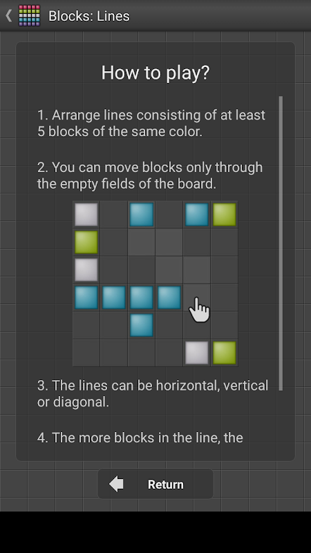 - Arrange lines consisting of at least 5 blocks of the same color. The more blocks in the line, the more points you get.