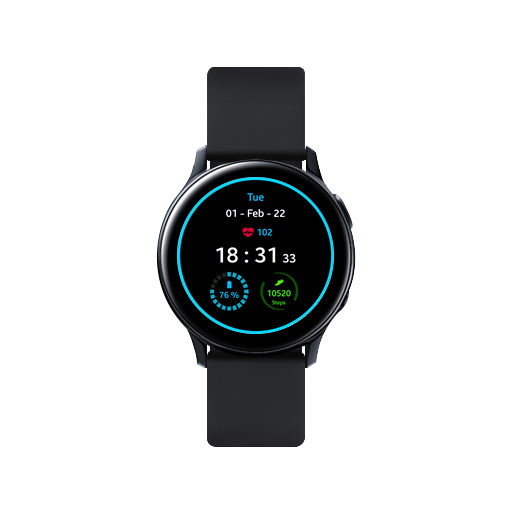 一個藍色的環形錶盤,一目了然地顯示時間、日期、心率、電池電量和步數。通過更改電池百分比環以及更改錶盤環,當電池電量不足時,錶盤會為您提供指示。如果您通過將步數更改為綠色來達到您的健身目標,它還會向您顯示一個指示器。錶盤支持 12 AM/PM 和 24 小時制。專為具有始終顯示功能的 Wear OS 設計。