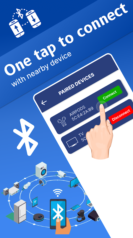 蓝牙自动连接 - 蓝牙设备查找器应用程序可以轻松将蓝牙设备连接到扬声器、藍牙耳機和 airpods,并传输文件。 有了这个藍牙連接,你可以忘记每次你想使用它们时配对和连接蓝牙设备的无聊过程。 一旦蓝牙设备在范围内,“蓝牙配对应用程序”就会自动检测并连接到您的蓝牙设备。